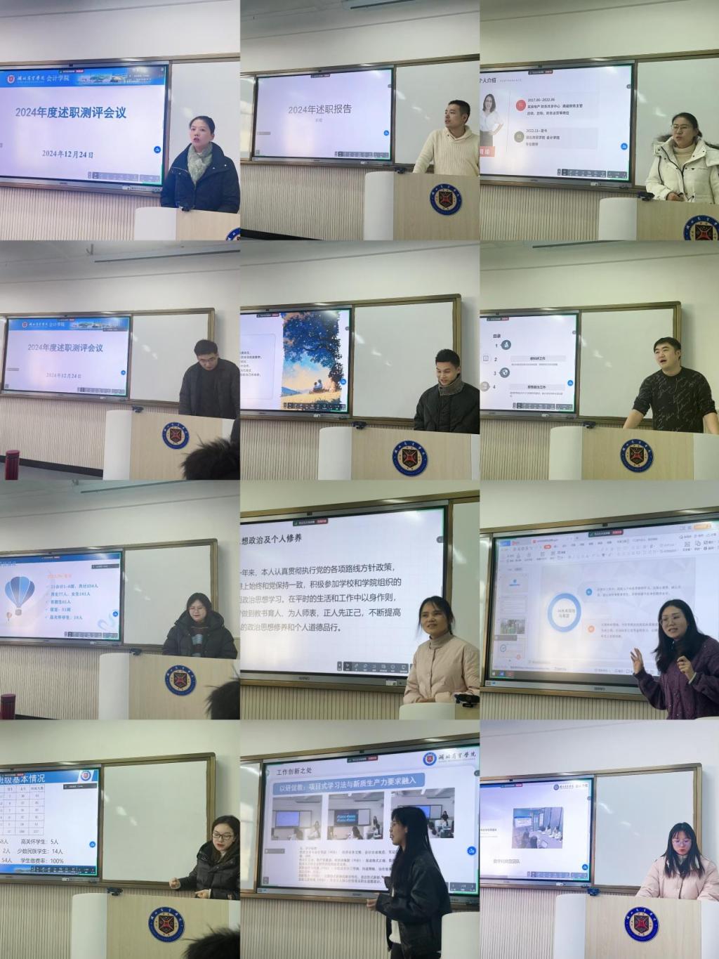其次,行政教辅部门汇报了行政管理、教学支持等方面的显著成绩。专任教师分享了教学、科研成果,反思了专业技能与学习能力,提出了提升计划。辅导员则总结了员工管理、思想政治教育等工作,分享了成功案例与良好师生关系的建立经验,强调了有效沟通的重要性。